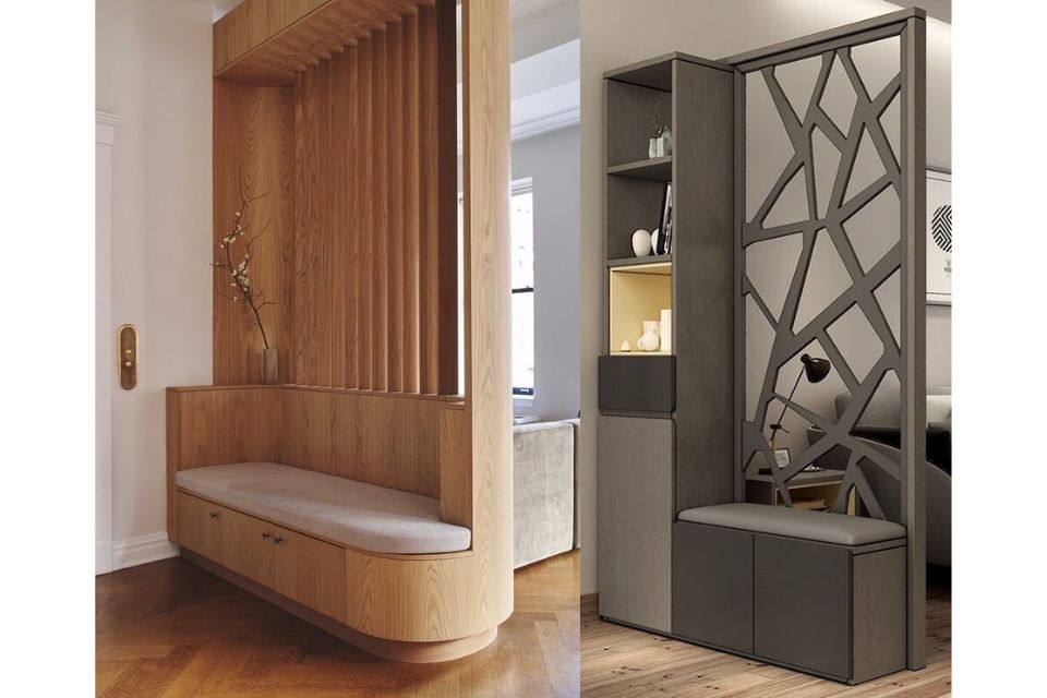 Selain itu, rak gantung kecil atau meja konsol dengan bentuk ramping bisa menjadi pilihan ideal. Desain meja konsol yang minimalis dengan permukaan yang bersih dan warna netral dapat memperkuat kesan modern dan elegan. Rak gantung atau meja ini juga bisa difungsikan untuk menyimpan barang-barang kecil sehingga area foyer tetap tertata rapi.